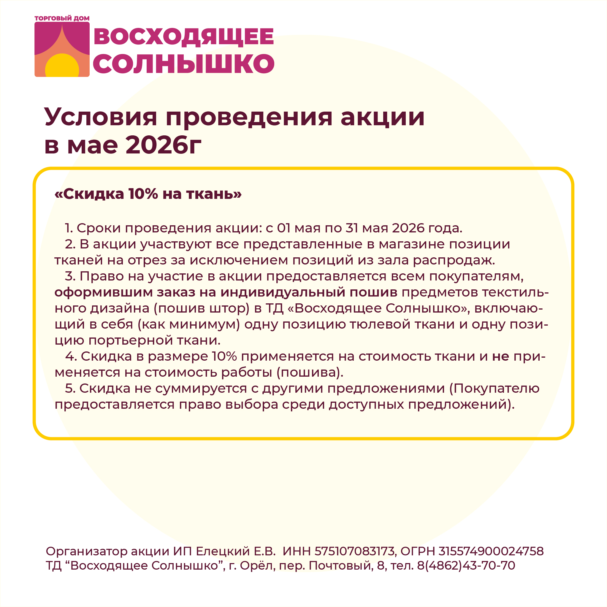 Дарим выгоду в мае -10% на ткани при заказе пошива портьер и тюля одновременно!